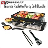 Entertaining has never been so easy or so much fun. This elegant stainless steel Swissmar Raclette Party Grill features a non-stick reversible grill / crêpe top; ideal for grilling meats and veggies, and is perfect for grilling sandwiches, smooth side is perfect for eggs, pancakes and crêpes. Gift boxed with 8 heat-resistant spatulas and raclette dishes. Also included is a FREE Raclette Recipe Book. Grill top, dishes and spatulas are dishwasher safe. Do not use steel wool, wire brushes or scouring detergents.