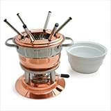 Discover one find that we ve had lots of fun with the Lausanne Copper 11-piece Fondue Set from SwissMar. For savory snacking, try heating oil or broth flavored with herbs in the stainless steel fondue pot, then put the spatter guard in place and let everybody cook cubes of steak or seafood. Cheese lovers can make the more familiar cheese-and-wine concoction using the white ceramic bowl as a kind of double boiler. Just add water to the fondue pot and pop the bowl on top. Melting cheese in the ceramic bowl prevents it from burning, and keeps it hot, bubbly and smooth for dipping. One of our favorite fondue recipes is chocolate fondue! We melt chunks of good dark chocolate with a little Grand Marnier to dip strawberries, butter cookies or unsalted pretzels to die for!
